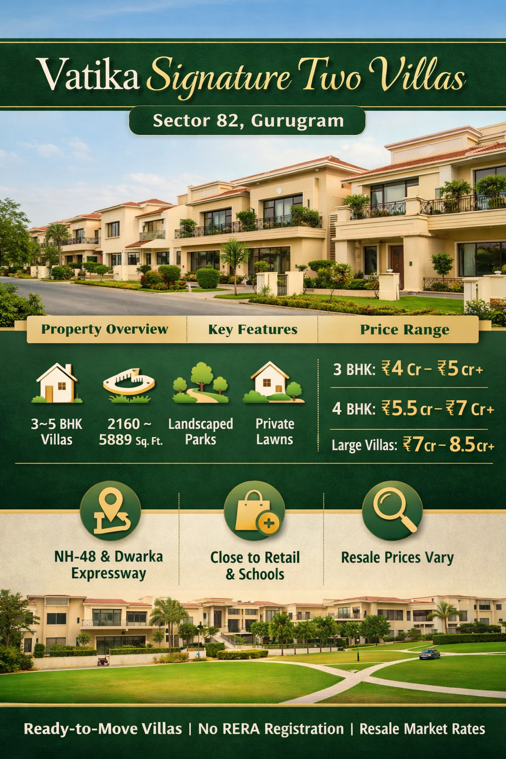 Vatika Signature Two Villas is a premium low?rise villa project located in Sector 82, Gurugram, within the Vatika India Next township. Spread across approximately 8 acres, the project offers around 100 independent villas with 3?BHK to 5?BHK configurations, ranging from 2,160?sq.ft to 5,889?sq.ft built-up area. Designed for luxury living, it emphasizes privacy, greenery, and spacious layouts, with wide roads, landscaped parks, and private lawns for each villa. Key amenities include 24×7 security, jogging tracks, tennis courts, dedicated parking, and sustainable utilities like rainwater harvesting and power backup for common areas. Being a low-density, low-rise development, it provides a horizontal living experience as opposed to high-rise apartment towers, making it ideal for families seeking independent homes. Current resale prices typically range between ?4.5?Cr to ?8?Cr+, depending on size, location, and villa features, though original builder pricing was lower. While the project does not appear to have a distinct Haryana RERA registration number, it is part of a reputable integrated township developed by Vatika Group, known for its focus on quality infrastructure and green living.